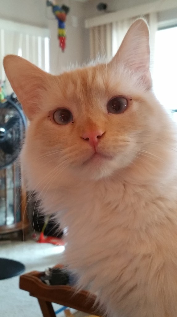 He is MY boy, he sits on my lap. He’s soft, a flame-point mix with white fur and crossed blue eyes. He’s very timid. And he’s gone.